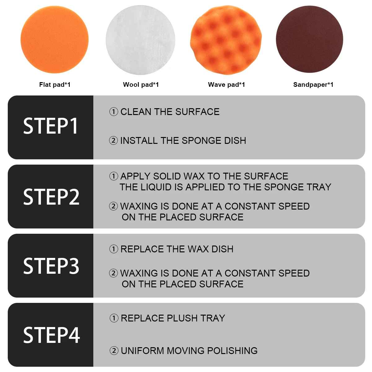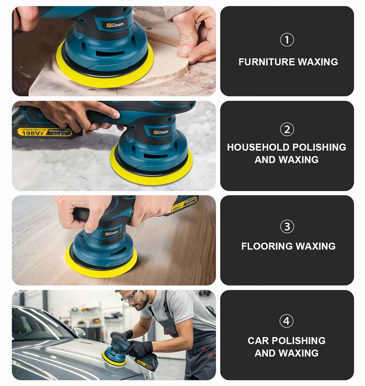 - Mnogostranska uporaba – poliranje avtomobilov, čiščenje umivalnikov/kadi, brušenje lesa, poliranje pohištva, masaža mišic, poliranje usnjenih površin.