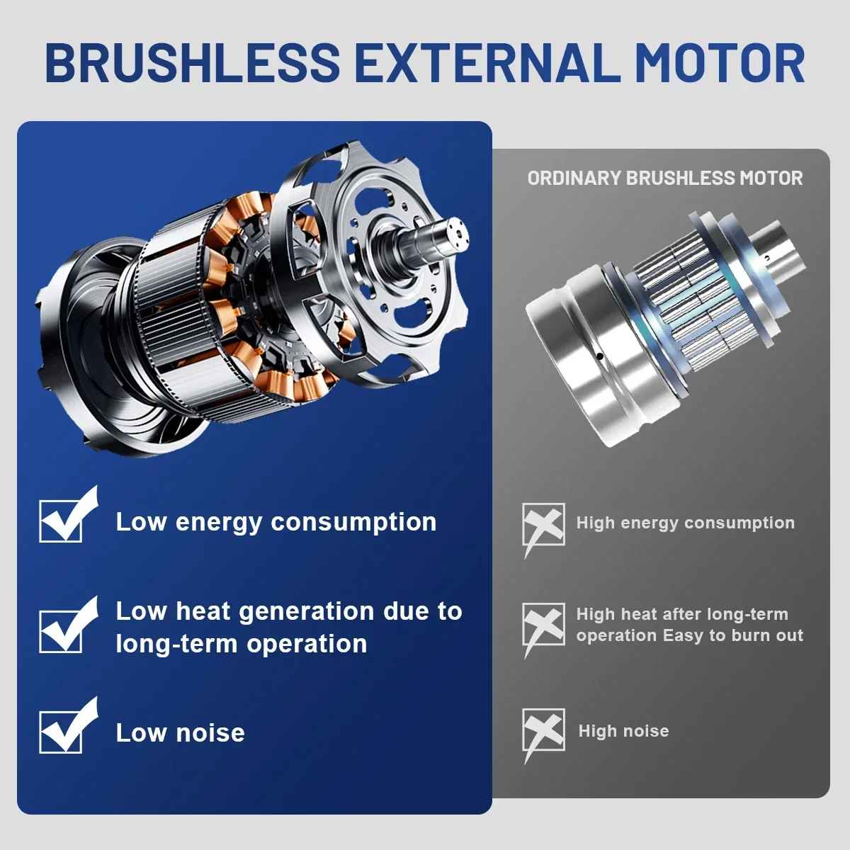 - Brushless zunanji motor – več moči, nižja poraba energije, manj segrevanja in tišje delovanje.