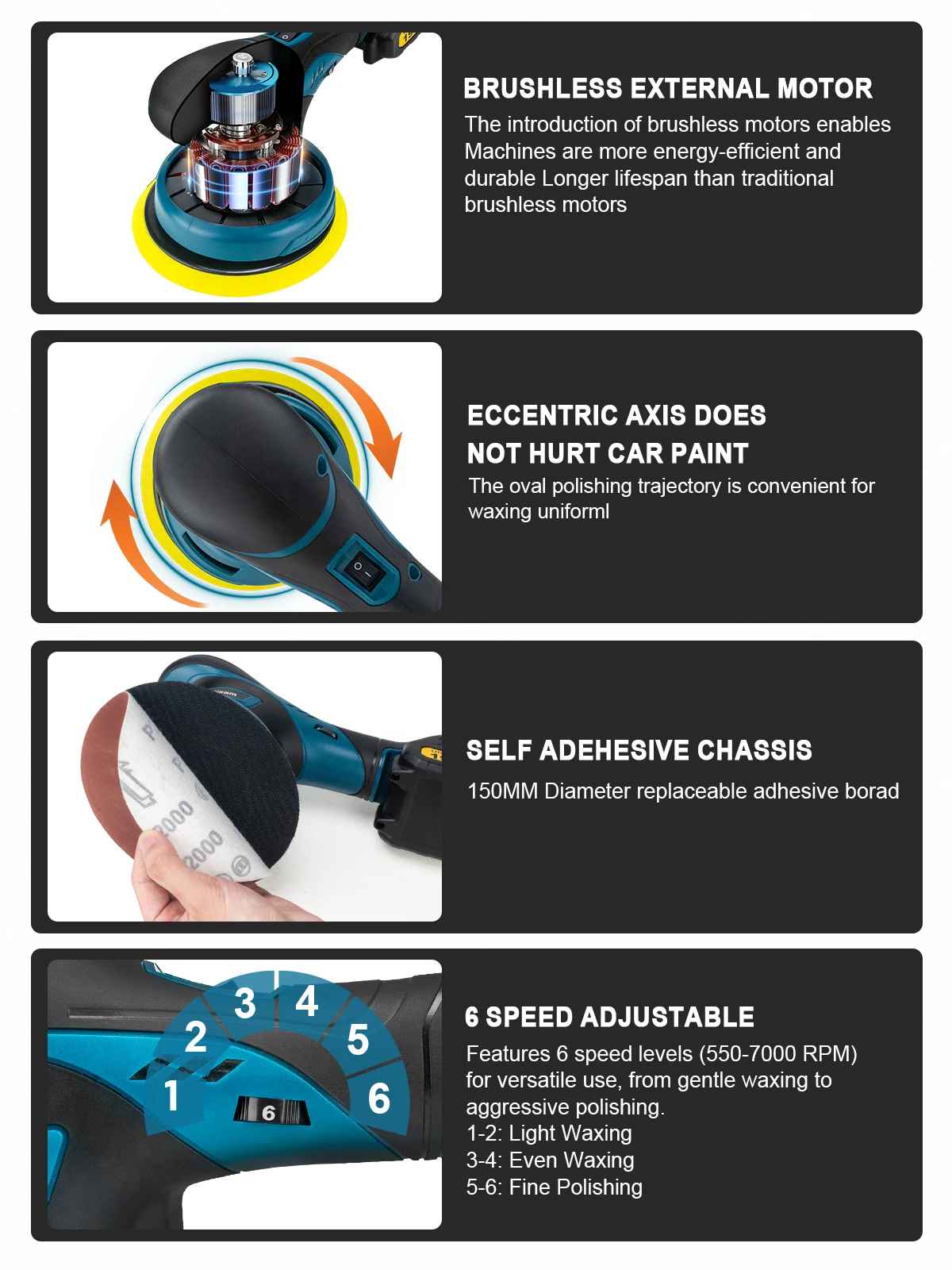 - Nastavljiva hitrost (1–6) – 550 do 7000 RPM, popolno za nanos voskov, glazur in sealantov.