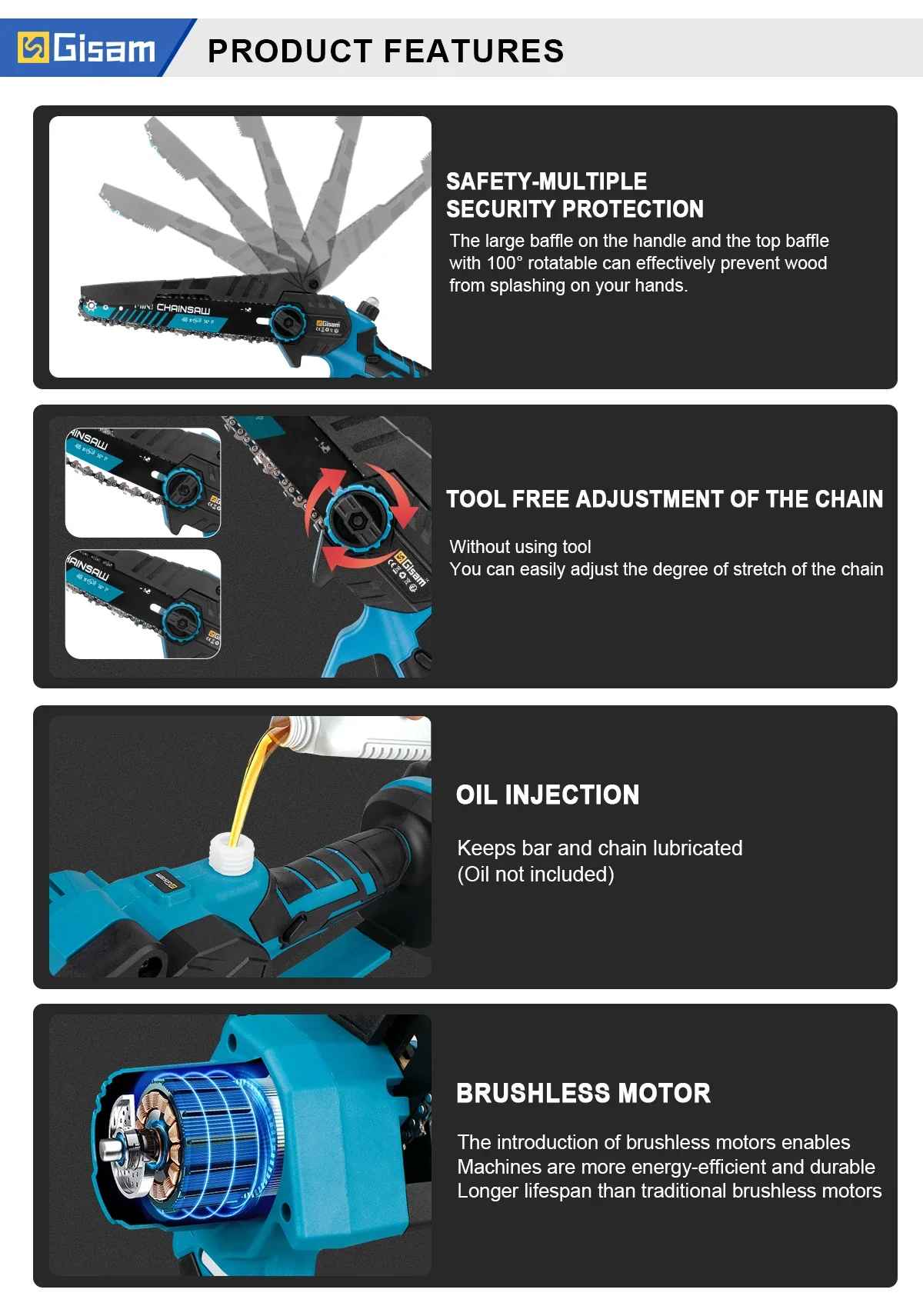 Brezkrtačna žaga GISAM je zmogljivo in zanesljivo orodje, ki združuje moč brezkrtačnega motorja z lahkotno in ergonomsko zasnovo. Idealna je za natančno rezanje lesa, plastike in drugih materialov v domači delavnici ali na terenu. Njena brezkrtačna tehnologija zagotavlja daljšo življenjsko dobo, manj vzdrževanja in večjo učinkovitost pri rezanju.