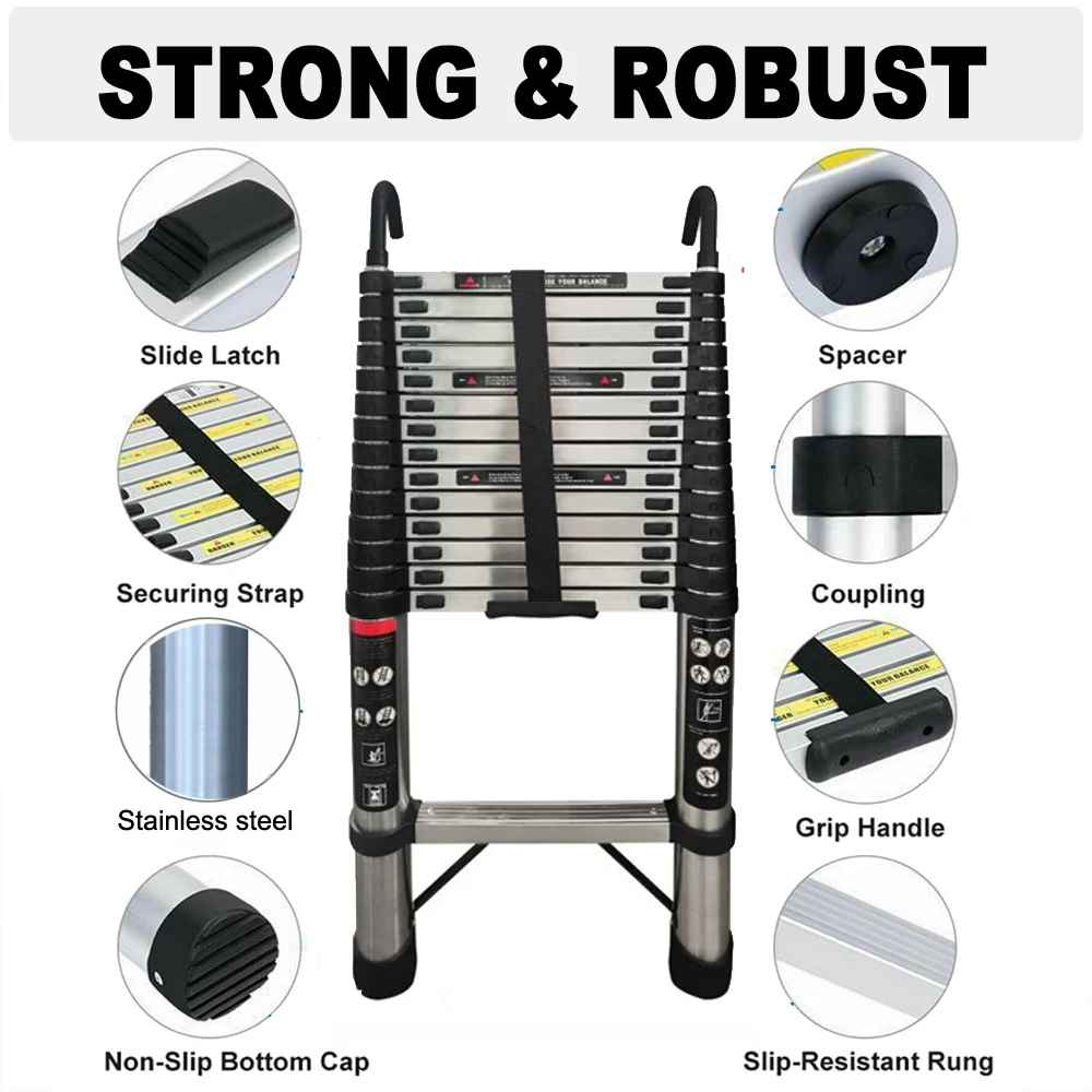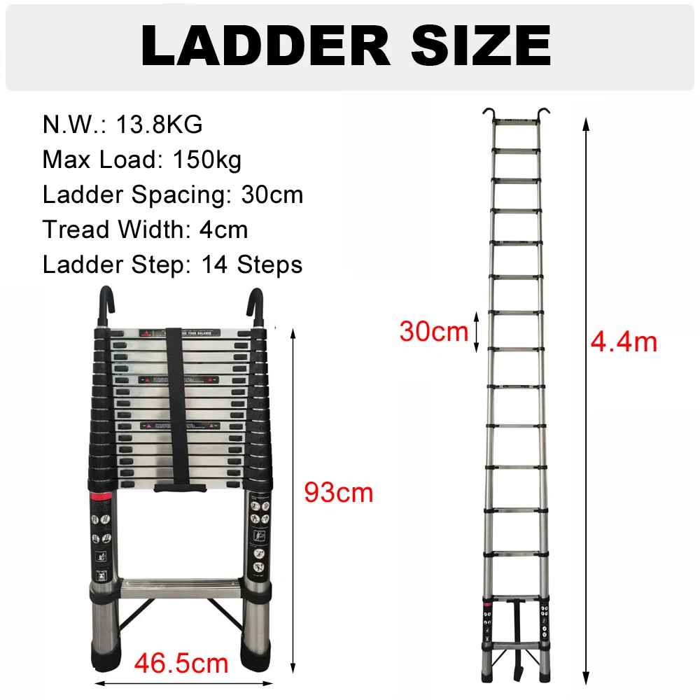 - Približne dimenzije: Višina zložene lestve: 93 cm; Višina raztegnjene lestve: 4,4 m