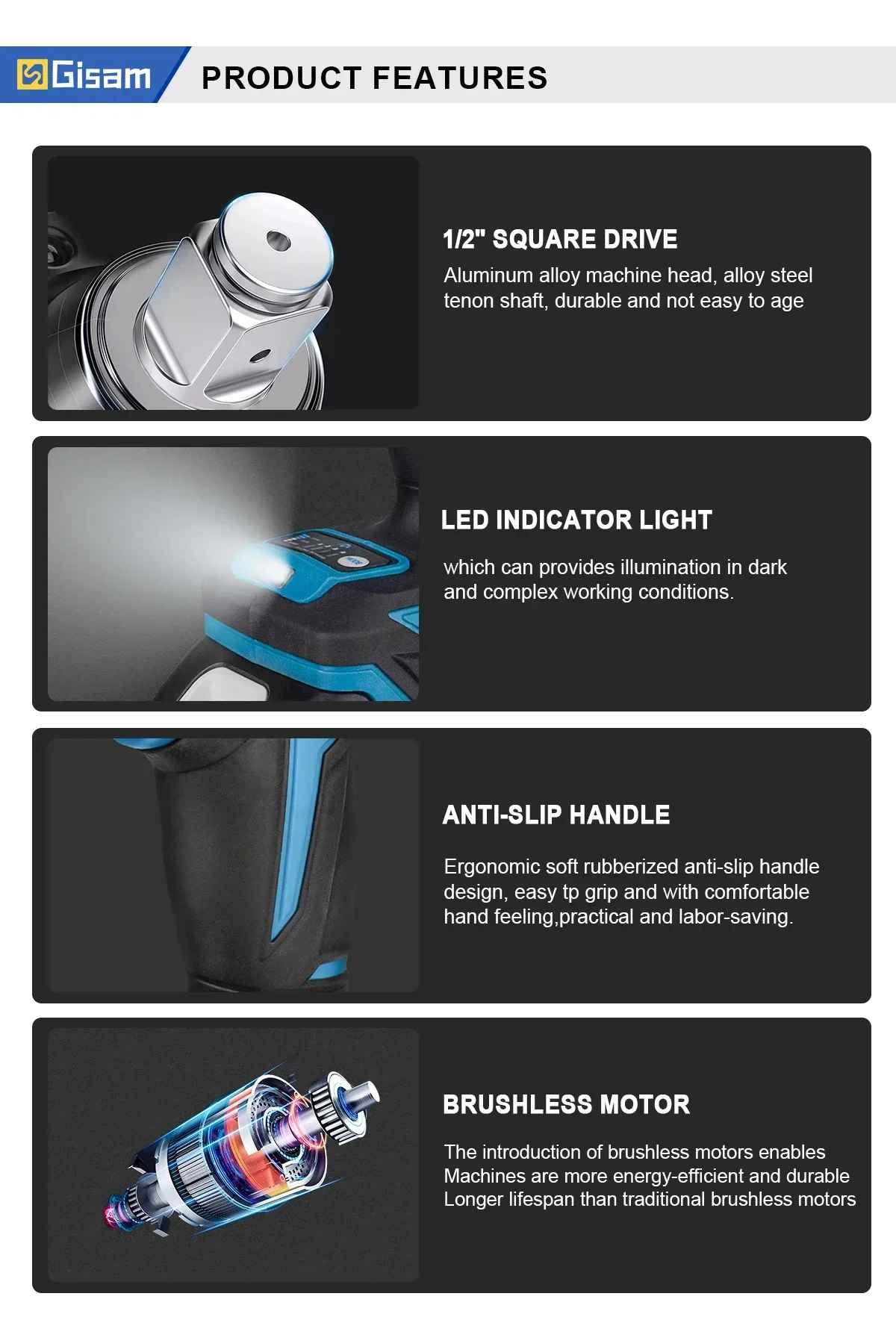 Udarni vijačnik GISAM z navorom 1200 Nm je zasnovan za uporabnike, ki potrebujejo več kot le osnovno orodje. Njegova moč omogoča enostavno delo pri sestavljanju kovinskih konstrukcij, montaži večjih elementov in celo pri občasni menjavi gum na osebnih vozilih. Zaradi brezkrtačnega motorja ponuja odlično učinkovitost, daljšo življenjsko dobo in manj vzdrževanja.